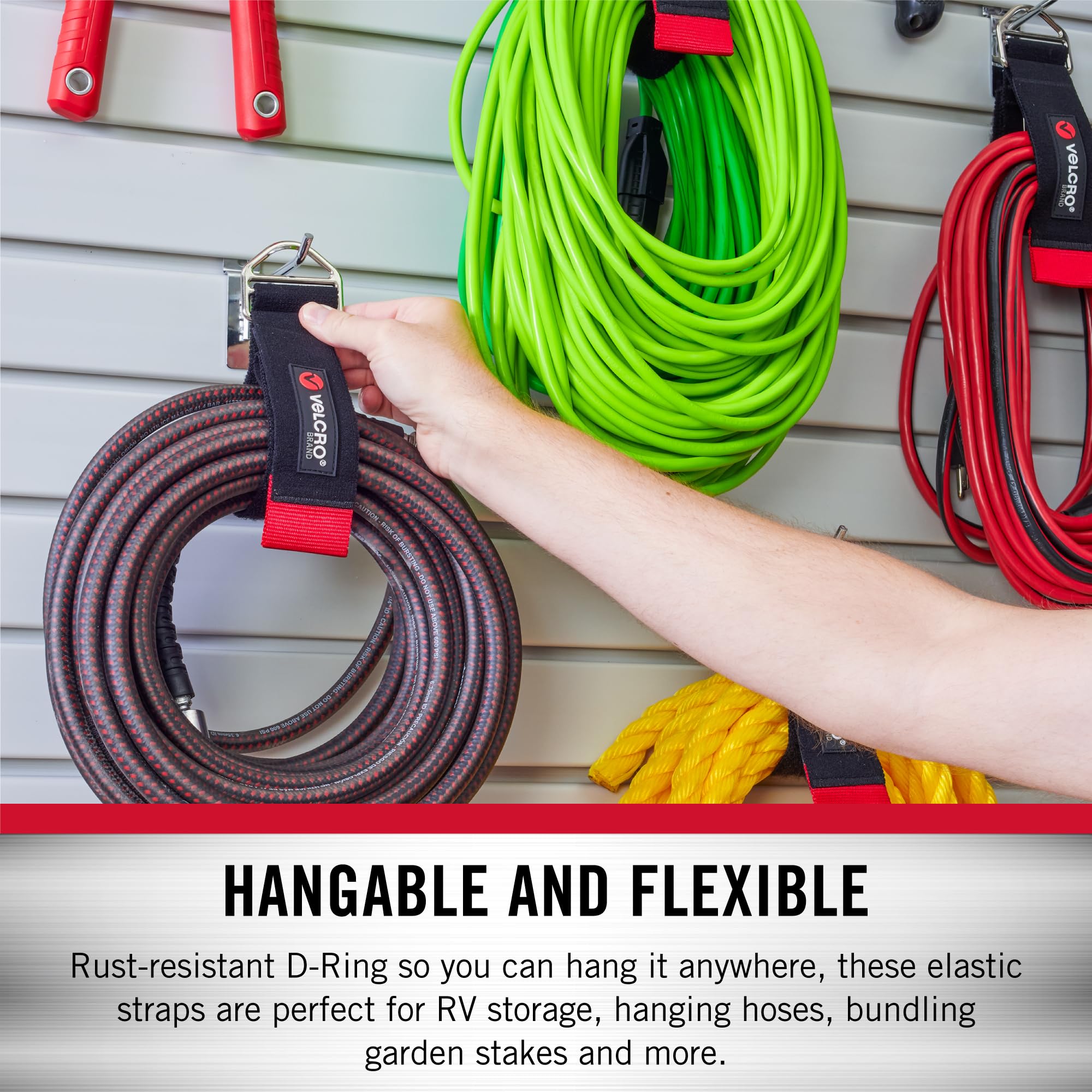 - HANGABLE AND FLEXIBLE: Rust-resistant D-Ring and so you can hang it anywhere, elastic straps are perfect for RV storage, hanging hoses, bundling garden stakes and more