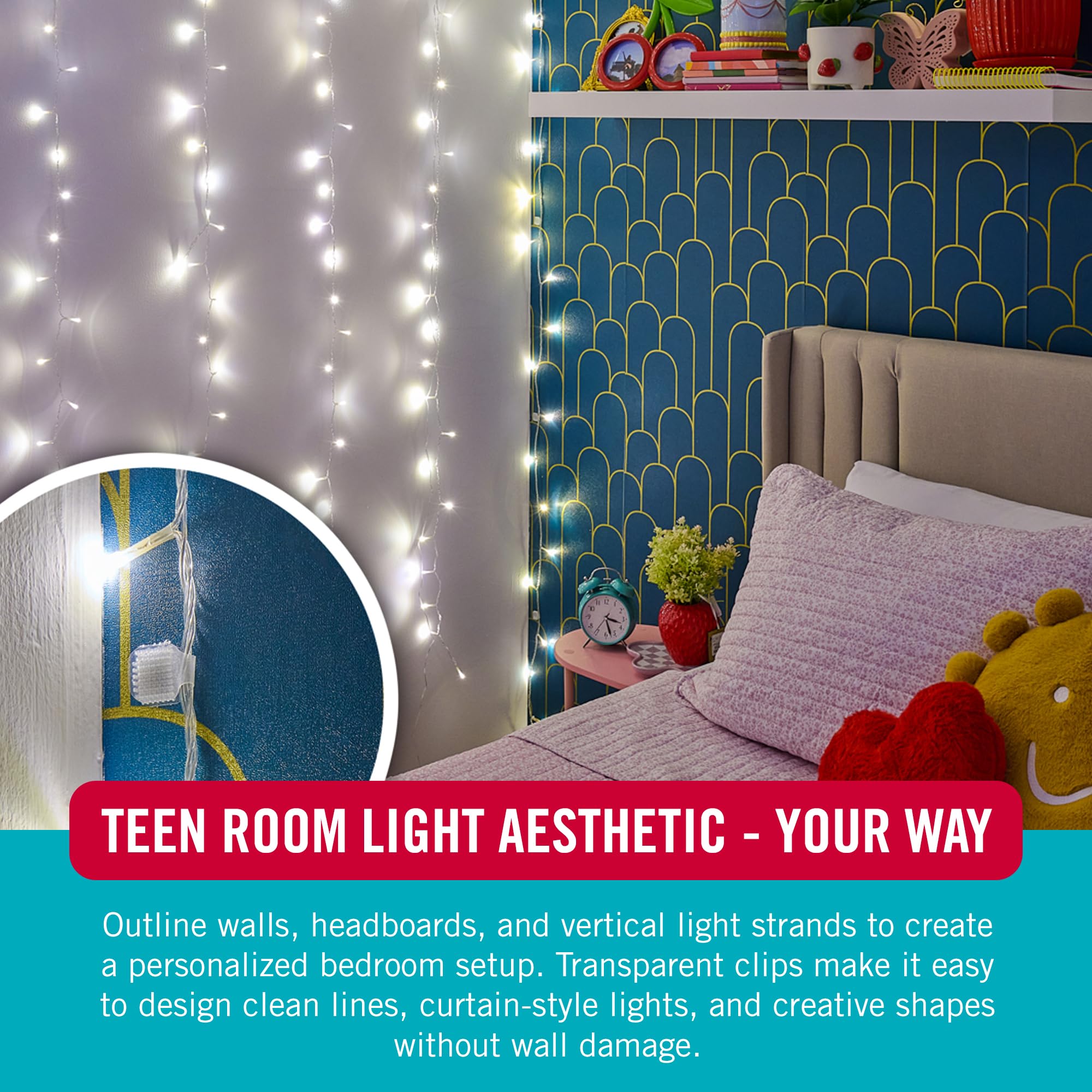 - ADHESIVE STRING LIGHT CLIPS FOR VERSATILE DECORATING: Support a wide range of layouts using light clips for indoor string lights in bedrooms, teen rooms, party setups, and college dorm rooms, offering flexible placement for light displays.