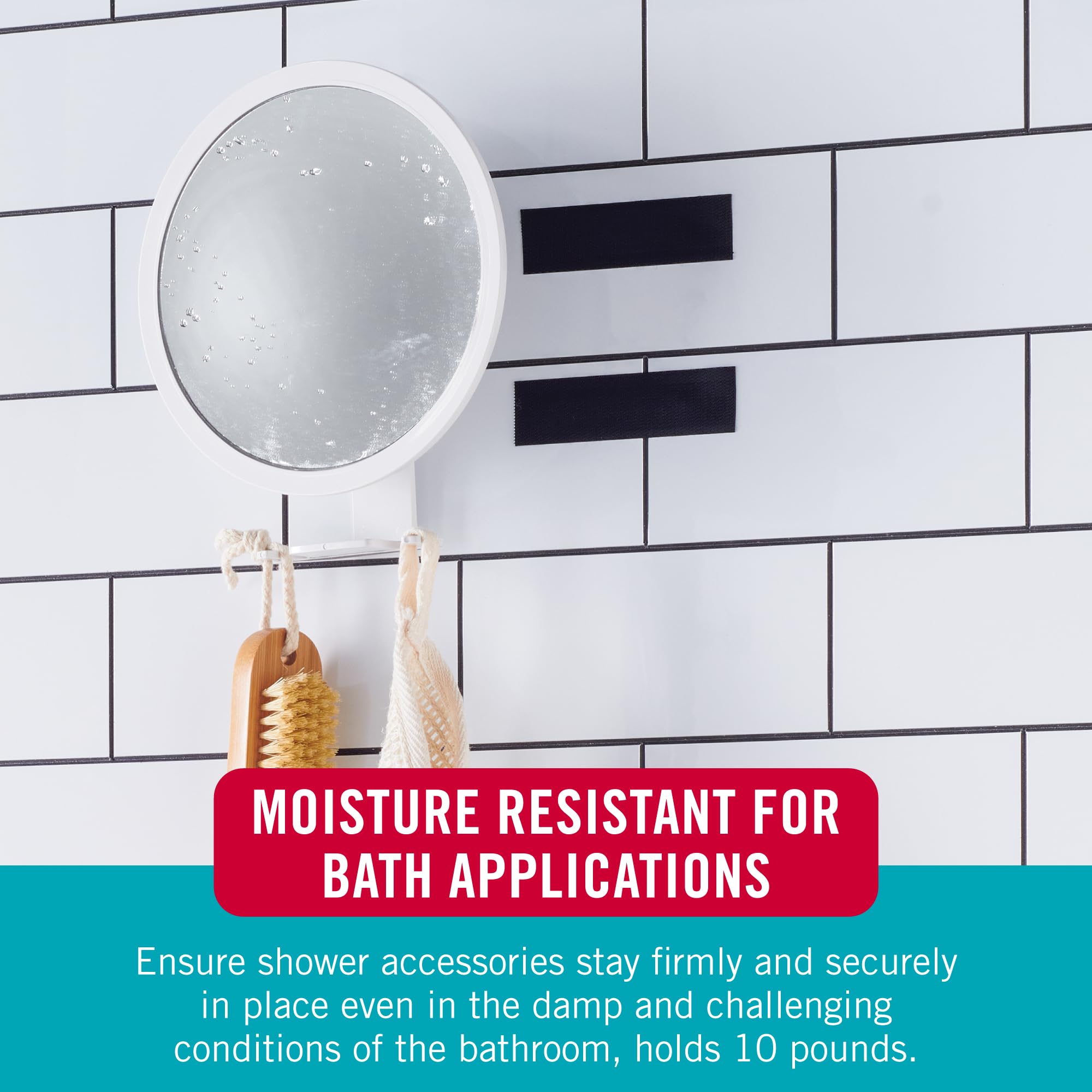 - MOISTURE RESISTANT FOR BATH APPLICATIONS: Ensure shower accessories stay firmly and securely in place even in the damp and challenging conditions of the bathroom, holds 10 pounds